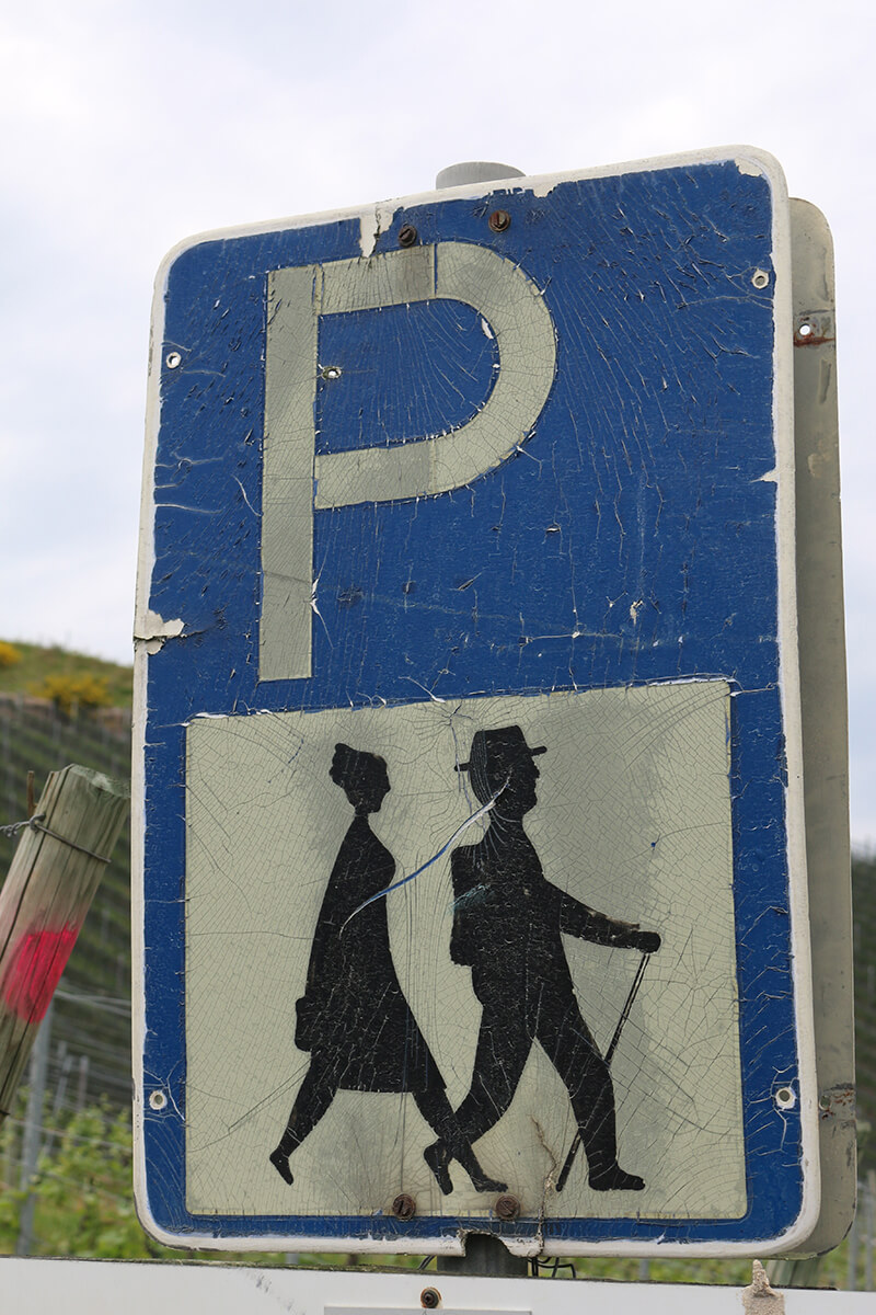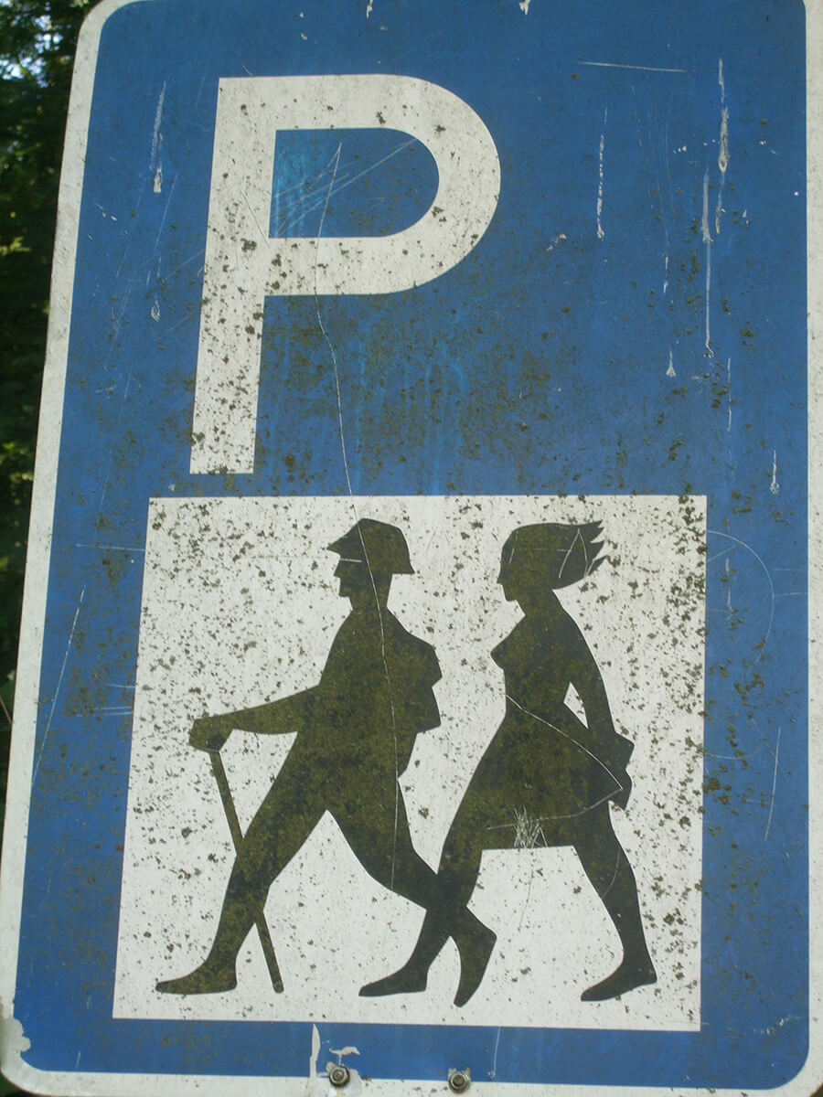 Natürlich freue ich mich auch immer, wenn ich ein Wanderparkplatz-Schild sehe. Der Wandersmann mit Hut und Stock, der voranschreitet. Die Wandersfrau, was sage ich, die Wanderdame dahinter, ohne Hut und Stock, dafür mit superkurzem Rock, Handtasche und wehenden Haaren. Die beide legen ein unglaubliches Tempo vor, das Schild ist definitiv das komischste Verkehrsschild Deutschlands. Interessanterweise gibt es eine badische Variante des Schildes, eine züchtigere Variante: Die Wanderdame hat einen knöchellangen Rock, die fliegenden Haare sind zum strengen Dutt geknotet. So geht es doch auch.
