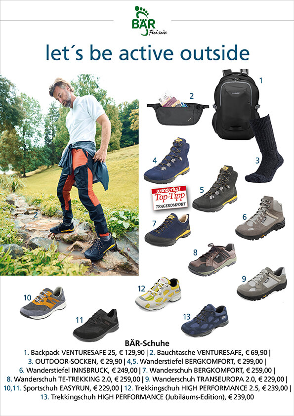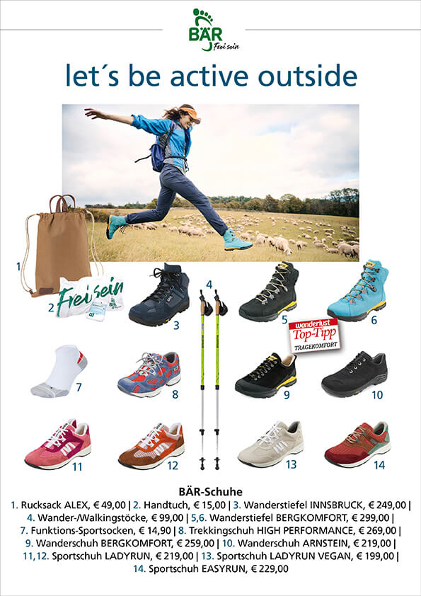 Mit das Wichtigste für Bewegung allgemein und insbesondere für den Sport draußen sind die richtigen Schuhe. Für Outdoor-Aktivitäten sollte man ein Augenmerk auf Schuhe mit genügend Stabilität, Dämpfung und Grip haben. Zudem sollten sie perfekt passen und nicht drücken, leicht und bequem sein. Die Marke BÄR ist Spezialist für Outdoorschuhe. Ob Wandern, Trekking, Laufen – es geht immer darum, die Natur hautnah und unbeschwert genießen zu können. Das gelingt, wenn die Füße das Erlebnis mittragen und unsere Sport-, Trekking- und Wanderschuhe für Damen und Herren sorgen dafür. Wir haben Ihnen unsere schönsten und beliebtesten Modelle in den folgenden beiden Collagen zusammengestellt, die nicht nur ultrabequem, sondern auch sehr modisch sind.