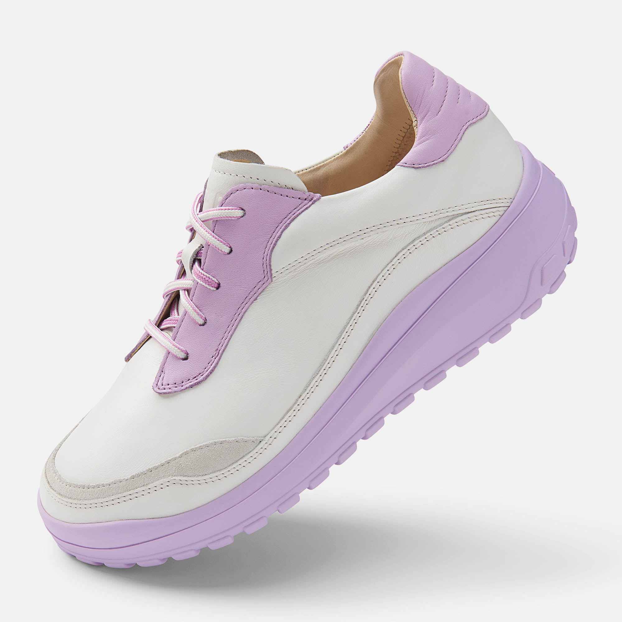 Christof Bär: Richtig ja, das sieht man auch. Ich meine, dadurch ist auch der Wettbewerb größer, weil wir nicht mehr allein in der Nische agieren können. Wir haben in den Bereichen natürlich auch Schuhe mitentwickelt, die dem entsprechen. Die Sneaker-Anmutung zählt hier. Bei uns ist es immer wichtig: was geben wir dem Schuh dann mit an Zehenfreiheit? Das ist das Grundthema, das funktioniert hier oder aber, wie wir es vorhin gesagt haben, auch sehr gut mit nachhaltigen Materialien, wie hier mit dem SEAQUAL-Faden, der auch sogar wasserabweisend ist. Leichtigkeit ist immer ein Thema, steht aber immer im Widerspruch mit dem, was der Fuß von der Anatomie her verlangt, weil leicht ist nicht immer so stabil, wie man es braucht und da muss man stark darauf achten, ob die Führung entsprechend vorhanden ist. Hier arbeiten wir mit Materialien und Material-Kombinationen, die dann auch die Wertigkeit des Produktes ausmachen. Wir haben hier z.B. eine TPU/PU Verbindung oder eine Latexsohle. Die ist jetzt nicht nur von der Nachhaltigkeit her top; die ist natürlich auch vom Zeitgeist, vom Trend so, dass wir auch funktionell noch in die Richtung gehen, zu sagen es gibt eigentlich kein weicheres Material als so eine Latexsohle, die dann dämpft und auf dünnstem Raum dann optimalen Komfort bietet. Damit verbunden haben wir den hohen Anspruch zu sagen, wir nehmen natürlich die modischen Strömungen auf. Mit einem simplen Design trotzdem etwas auf den breiten Leisten zu übersetzen, was gut aussieht, was tragbar ist oder was es auch widerspiegelt - das ist unser Ziel und funktioniert über die Materialien, über die Materialstrukturen, über die Farben oder eben auch über Details, z.B. über bunte Sohlen oder Senkel, die aktuelle Trends widerzuspiegeln. Oder wir arbeiten mit kleinen Themen und Accessoires - wie hier die Herzchen. Wir machen den Reißverschluss sichtbar, setzen wertige Schieber ein. Um eben auch hier etwas zu bieten, was 100% Komfort bietet, aber trotzdem zu trendigen Themen tragbar ist.